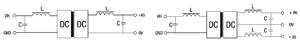 为减小模块电源的纹波和噪声,可以在DC/DC模块的输入和输出端加LC滤波器,如图5所示。图5左图是单输出,图5右图是双输出。