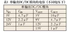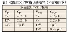 在表1及表2中列出1W DC/DC模块的VIN端和VOUT端在不同输出电压时的电容值。要注意的是,电容量不能过大而造起动问题,LC的谐振频率必须与开关频率要错开以避免相互干扰,L采用μH极的,其直流电阻要低,以免影响输出电压精度。